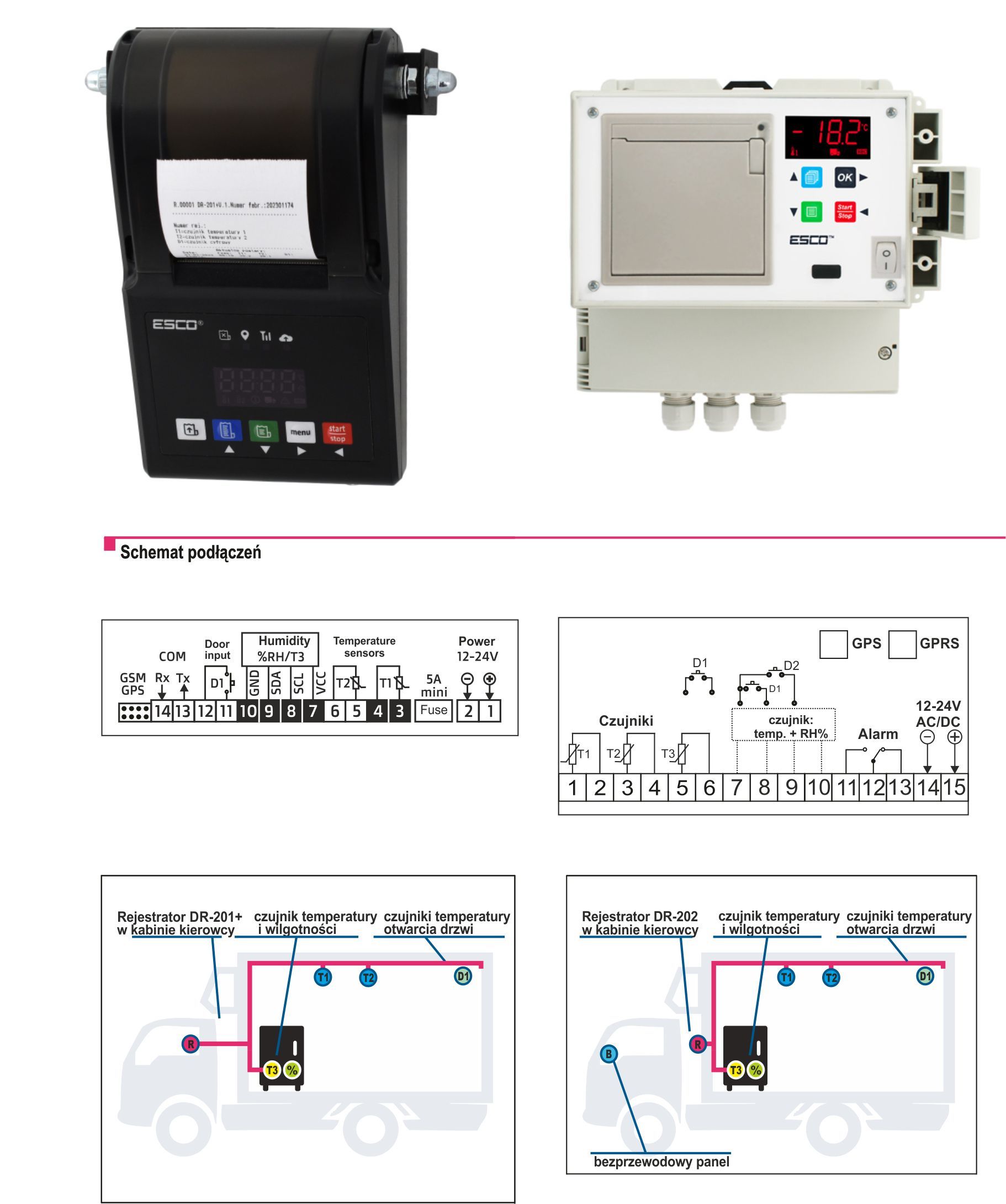 Czujnik temperatury i wilgotności do rejestratorów DR201+ oraz DR202, stosowany jako trzeci czujnik pomiarowy. Wykorzystywany jest do monitorowania temperatury i wilgotności w zabudowie chłodniczej podczas transportu samochodowego produktów wymagających stałej kontroli warunków na całej trasie przewozu. Czujnik zapewnia precyzyjny pomiar parametrów środowiskowych w czasie rzeczywistym, wspomagając kontrolę jakości transportowanych towarów. Sprzedawany jest jako akcesorium dodatkowe.