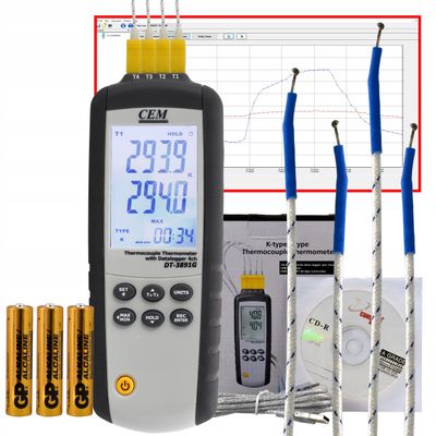 • Wyposażenie standardowe: 4x sonda perełkowa temperatury typu K (pomiar temperatury powietrza) DT-3891G, kabel USB, płyta CD z oprogramowaniem