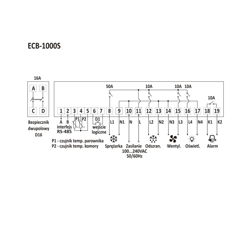 wyjścia: sprężarka; odszranianie; wentylator; alarm; oświetlenie, RS485