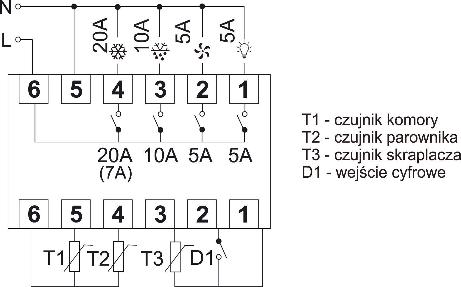 wyjścia: sprężarka; odszranianie; wentylator, oświetlenie