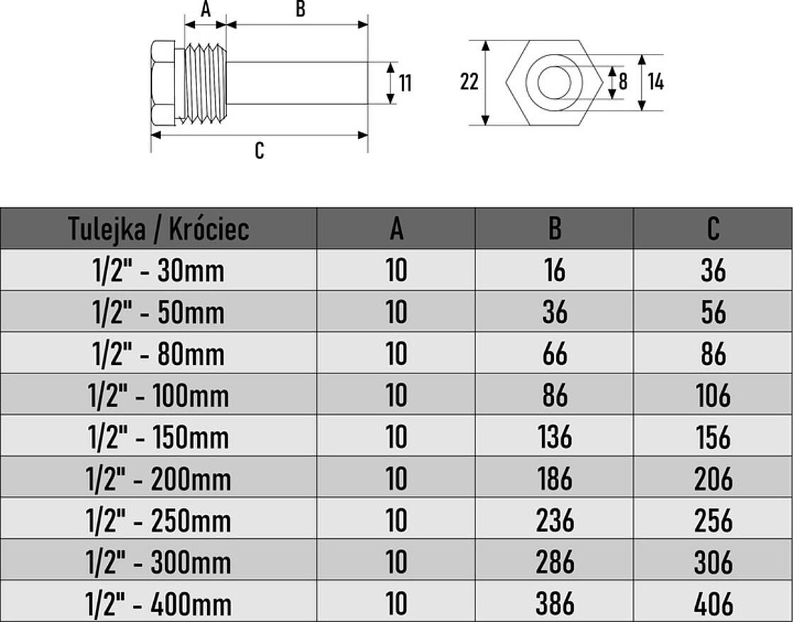 gwint: G1/2" długość: 200mm średnica zewnętrzna: 11mm średnica wewnętrzna: 8mm materiał: mosiądz