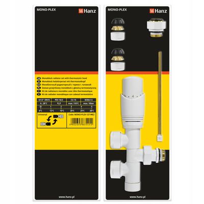 Elegancki biały zawór termostatyczny z głowicą, idealny do grzejników łazienkowych. Zapewnia precyzyjną kontrolę temperatury i estetyczne wykończenie. Uniwersalna konstrukcja lewo/prawo ułatwia montaż.