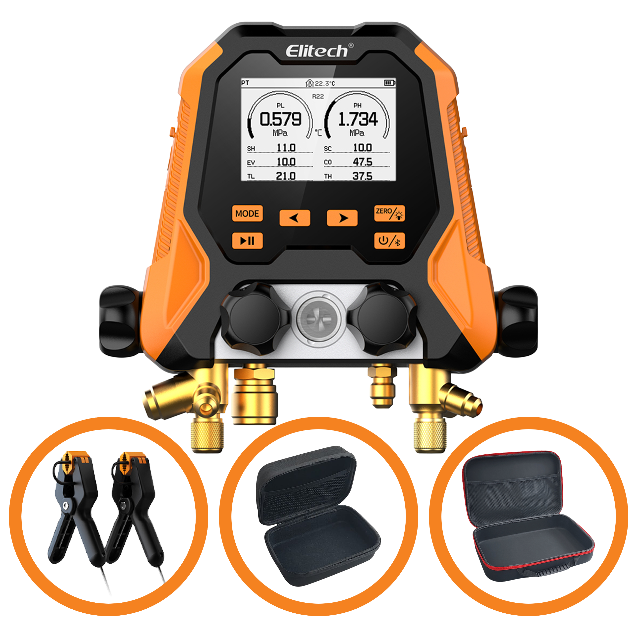 MS-870 to profesjonalny, 4-zaworowy zestaw manometrów cyfrowych do diagnostyki i serwisu klimatyzacji oraz chłodnictwa, umożliwiający pomiar ciśnienia, temperatury i próżni oraz kontrolę szczelności. Dzięki Bluetooth współpracuje z aplikacją Elitech Tools, obsługuje ponad 140 czynników chłodniczych (z aktualizacją), automatycznie oblicza przegrzanie i dochłodzenie oraz oferuje kompensację temperatury. Podświetlany ekran LCD, klasa IP54 i do 150 godzin pracy zapewniają wygodę i niezawodność w codziennym użytkowaniu.