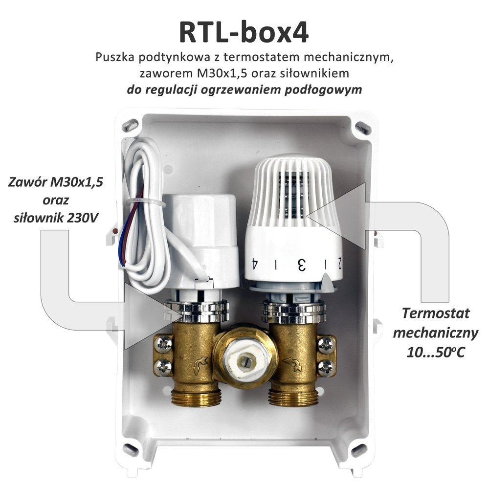 RTL służy do ograniczenia temperatury czynnika w instalacji ogrzewania podłogowego w systemach nie przekraczającej 20 m2. Zastosowanie ogranicznika temperatury eliminuje konieczność zabudowy zaworu mieszającego i dodatkowej pompy obiegowej.