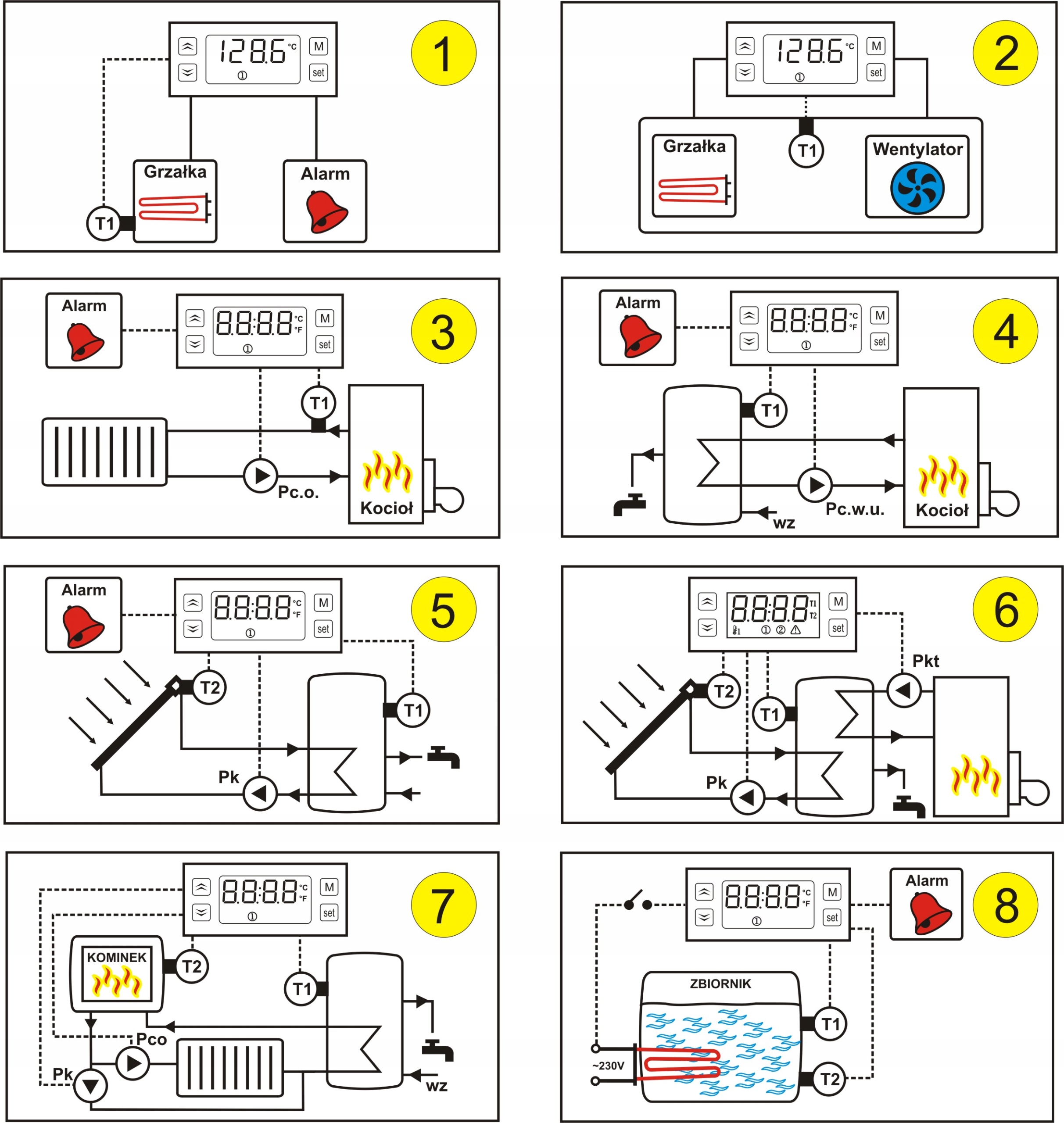 alarmu wysokiej i niskiej temperatury po przekroczeniu, których zostanie załączone wyjście przekaźnikowe pomocnicze i wewnętrzny brzęczyk. W momencie wystąpienia alarmu wyjście główne może zostać zablokowane w pozycji załączonej lub wyłączonej (zależy od układu np. przy wzroście temp. w kominku pompa musi być załączona, aby wychładzać obieg)