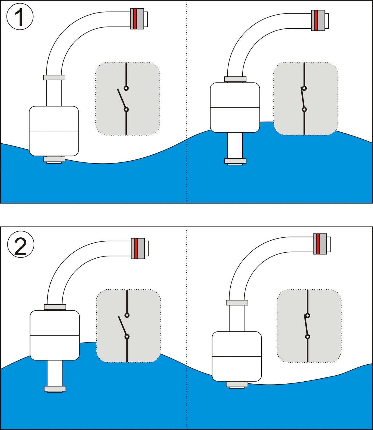 1. Normalnie otwarty - gdy poziom cieczy opadnie poniżej poziomu czujnika obwód zostanie rozłączony