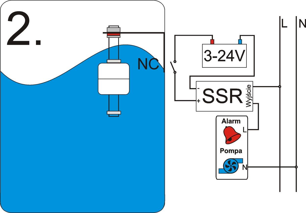 2. Normalnie zamknięty - gdy poziom cieczy opadnie poniżej poziomu czujnika obwód zostanie załączony