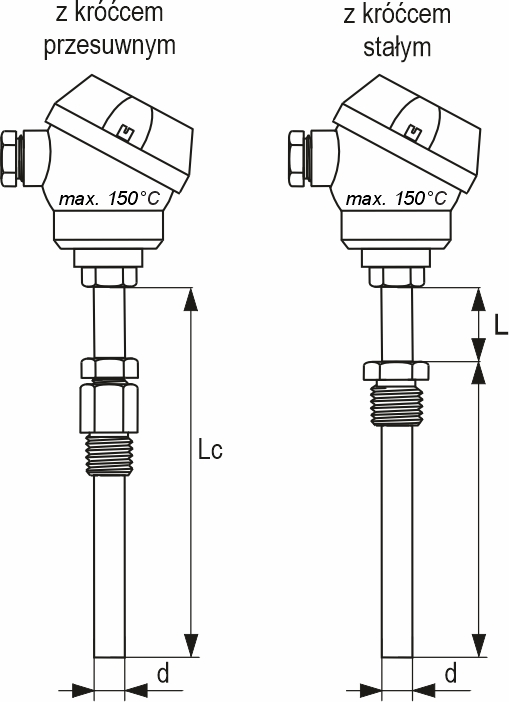 Czujnik do pomiaru temperatury gazów i cieczy w zbiornikach i rurociągach. Wyposażony jest w głowicę przyłączeniową typu MA, B lub NA. Możliwy montaż przetwornika w głowicy (typ B lub NA).
