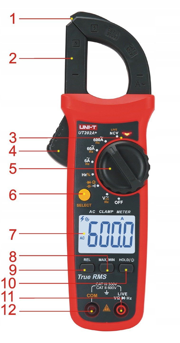 pomiar napięcia DC: 600mV~600V pomiar napięcia AC: 6V~600V pomiar natężenia prądu AC: 6A~600A pomiar rezystancji w zakresie: 600Ω~60MΩ