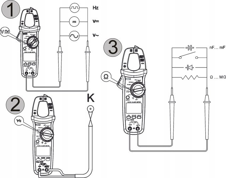 Pomiar napięcia DC: 600mV~6V~1000V Pomiar napięcia AC: 6V~750V Pomiar natężenia prądu AC/DC: 60A~600A Pomiar rezystancji w zakresie: 600Ω~60MΩ Pomiar pojemności kondensatorów: 99nF~60mF Pomiar temperatury w zakresie: -40~1000 °C