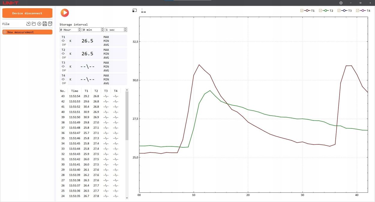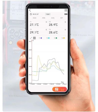 Profesjonalny poczwórny rejestrator temperatury UNI-T UT325F z rejestracją 72000 próbek. Obsługuje 7 typów termopar, posiada Bluetooth, USB-C, precyzyjny pomiar i eksport danych. Idealny dla HACCP.