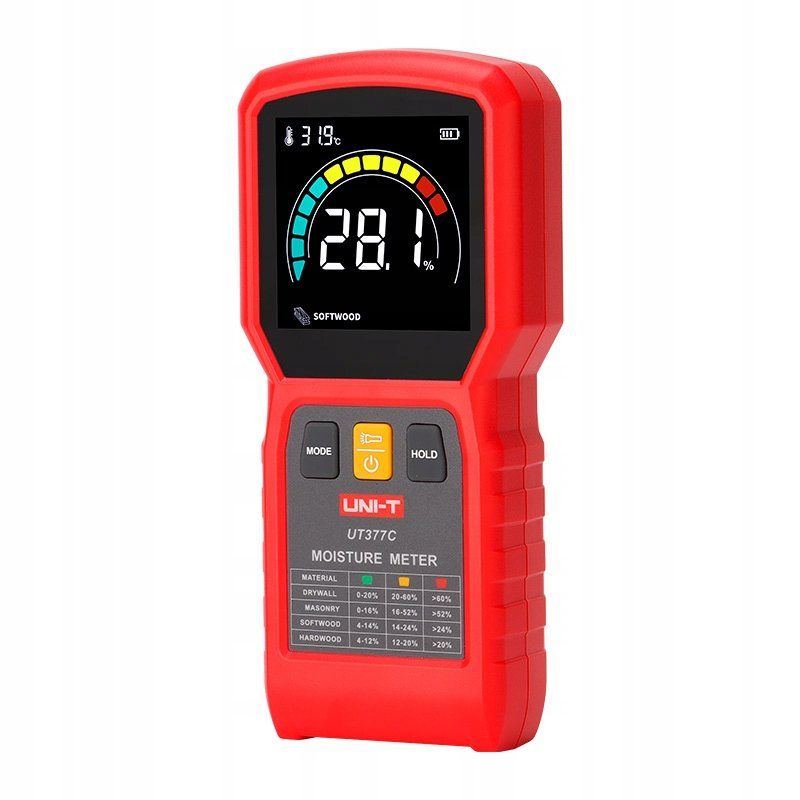 UT377C służy do bezinwazyjnego badania poziomu wilgotności ścian, stropów i podłóg wykonanych z cementu lub gipsu. Jest idealnym przyrządem do oceny dojrzałości tynków lub posadzek przed położeniem wszelkiego rodzaju pokryć takich jak farby, płytki, panele lub podłogi drewniane. Poziom wilgotności jest mierzony do głębokości 30mm materiału, wykorzystując metodę pomiaru falami radiowymi o wysokiej częstotliwości. Stopień zawilgocenia jest odczytywany na wyświetlaczu LCD. Wartość ta odpowiada wilgotności względnej materiału i zależy od rodzaju materiału.