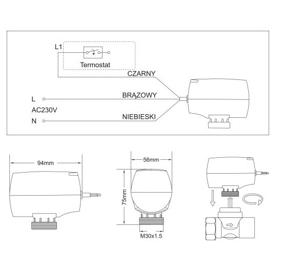napięcie robocze 230V zakres temperatur od 0°C do 110°C dwa przyłącza, gwint wewnętrzny 1/2” cala