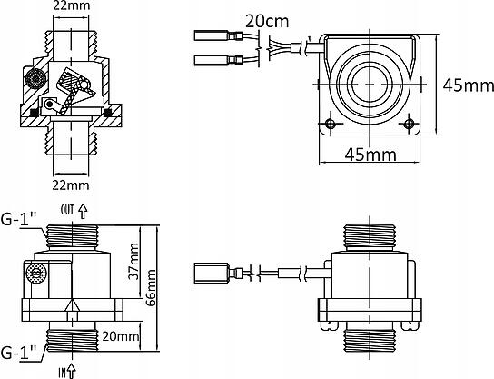 Czujnik wyposażony w styk no, który pod wpływem siły wyporu cieczy powoduje zwieranie lub rozwieranie kontaktronu.