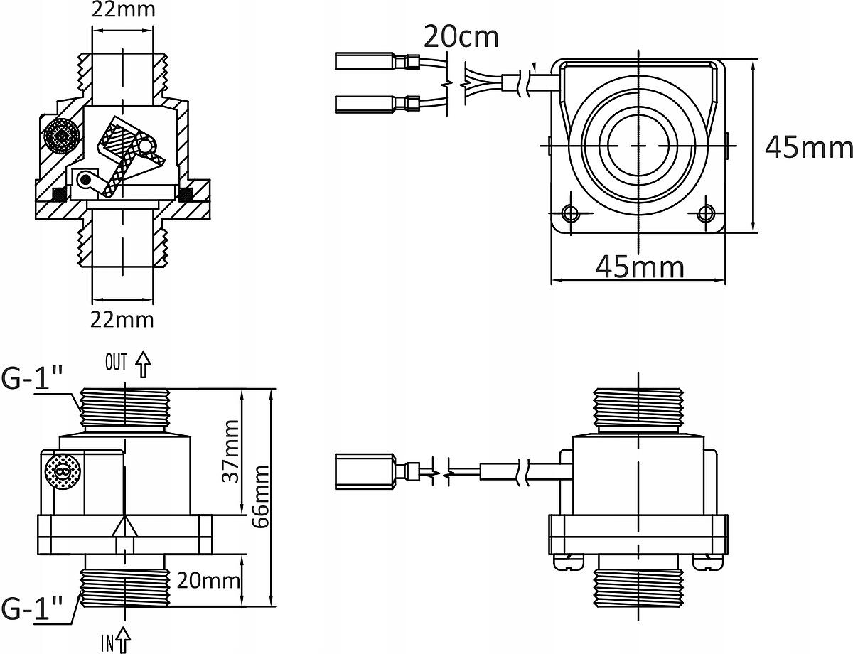 Czujnik wyposażony w styk no, który pod wpływem siły wyporu cieczy powoduje zwieranie lub rozwieranie kontaktronu.