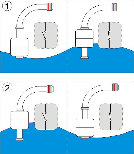 2. Normalnie zamknięty - gdy poziom cieczy opadnie poniżej poziomu czujnika obwód zostanie załączony