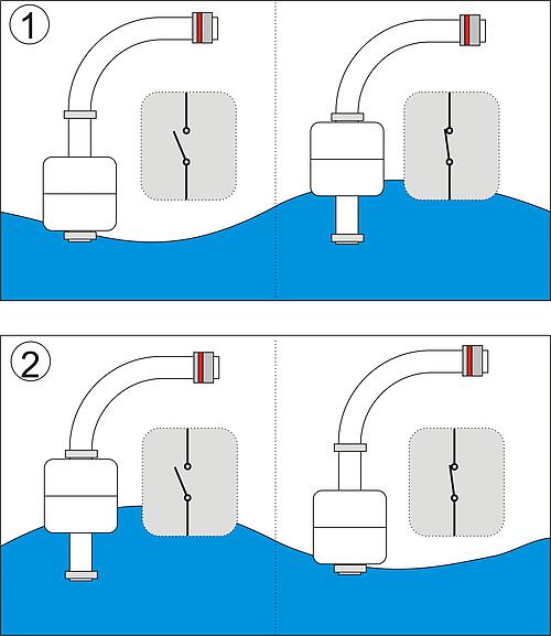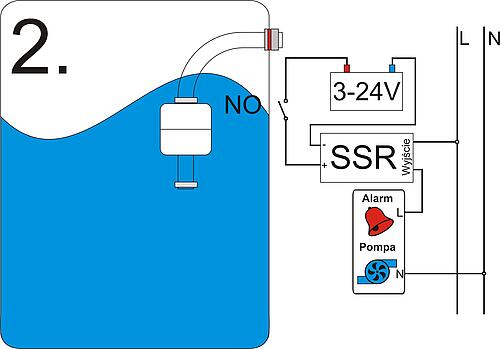 2. Normalnie zamknięty - gdy poziom cieczy opadnie poniżej poziomu czujnika obwód zostanie załączony