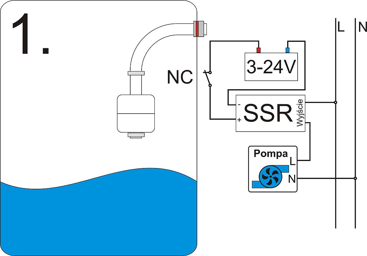 1. Normalnie otwarty - gdy poziom cieczy opadnie poniżej poziomu czujnika obwód zostanie rozłączony