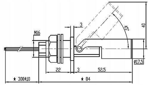 Czujnik poziomu cieczy (włącznik/wyłącznik) pływakowy. Przeznaczony do montażu bocznego z zewnętrznej strony zbiornika, za pomocą kołnierza uszczelniającego. Sonda może kontrolować górny jak i dolny poziom cieczy w zbiorniku. Czujnik posiada pływak z wbudowanym magnesem. Ciecz siłą wyporu przesuwa pływak, po rurce, co powoduje zwieranie lub rozwieranie wbudowanego kontaktronu. Czujnik można stosować do różnego rodzaju cieczy np. woda, ścieki, olej.