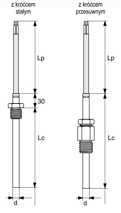 Czujnik z króćcem z gwintem stałym lub przesuwnym. Przeznaczony do pomiaru temperatury w różnych dziedzinach przemysłu. Pomiar cieczy, gazów i ciał stałych.