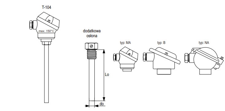 Czujnik do pomiaru temperatury gazów, cieczy i ciał stałych w zbiornikach, instalacjach C.O. i rurociągach. Wyposażony jest w głowicę przyłączeniową typu MA, B lub NA oraz osłonę do montażu na instalacji. Możliwy jest montaż przetwornika w głowicy (typ B lub NA).