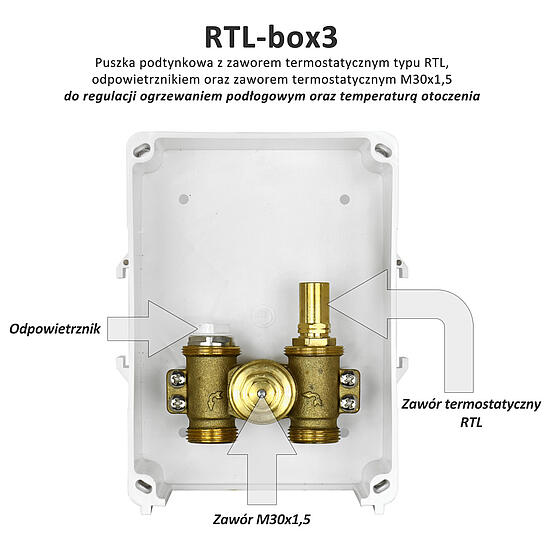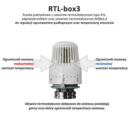 Kasetowy ogranicznik temperatury do ogrzewania podłogowego montowany w estetycznej skrzynce z frontem plastikowym. Zestaw składa się z głowicy RTL, zaworu termostatycznego z wkładką UBG o zwiększonym przepływie, głowicy termostatycznej, odpowietrznika i zaworu M30x1,5.