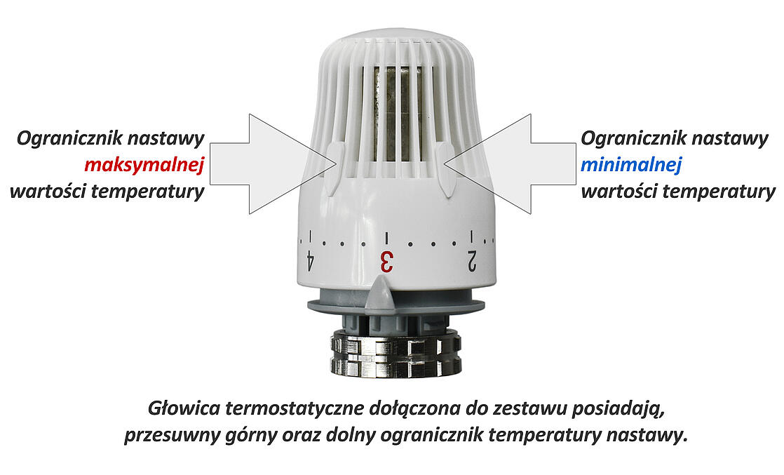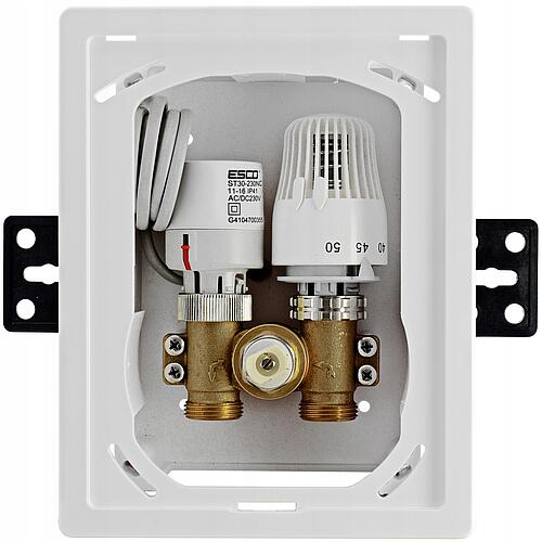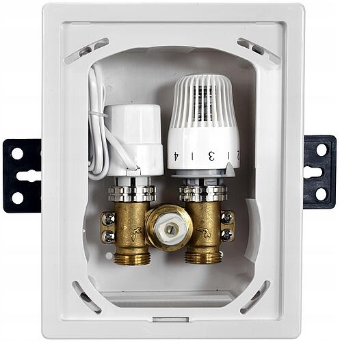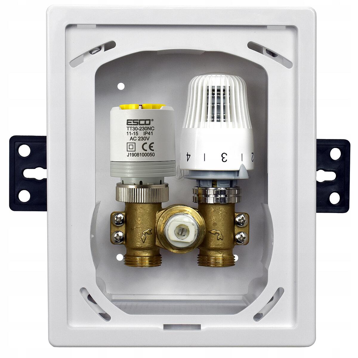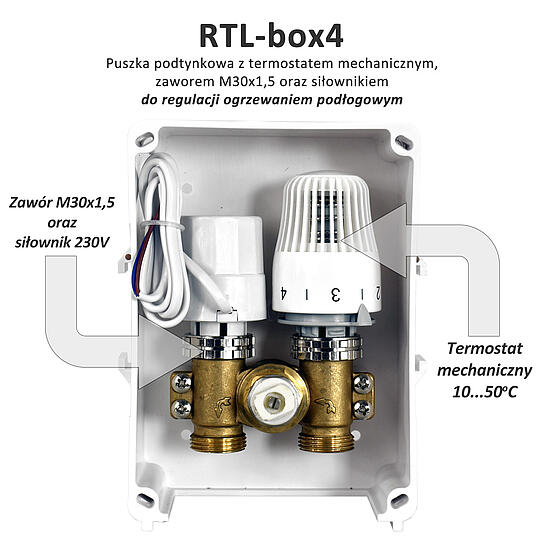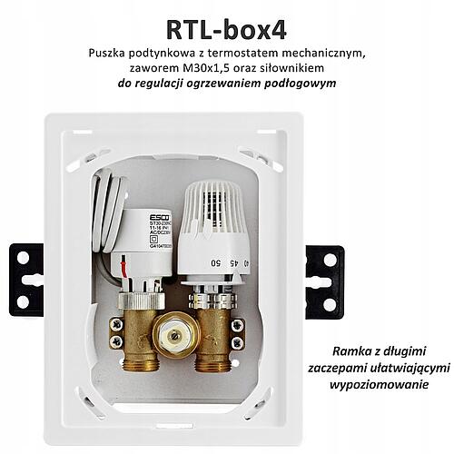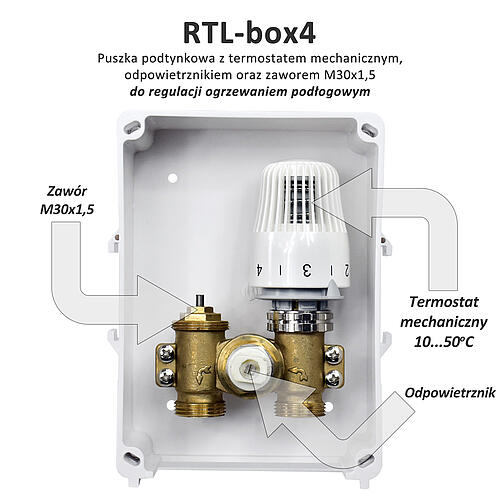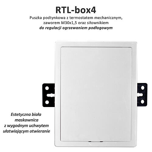 Kasetowy ogranicznik temperatury do ogrzewania podłogowego montowany w estetycznej skrzynce z frontem plastikowym. Zestaw składa się z głowicy RTL, zaworu termostatycznego z wkładką UBG o zwiększonym przepływie, odpowietrznika, zaworu M30x1,5 i siłownika termicznego. Zestaw montowany jest na powrocie pętli ogrzewania podłogowego. Zakres regulacji głowicy zapewnia właściwą temperaturę czynnika grzewczego podczas przepływu przez pętlę. Siłownik termiczny, podpięty do regulatora pokojowego uruchamia ogrzewanie w określonych temperaturach.