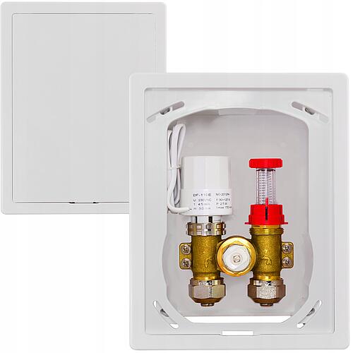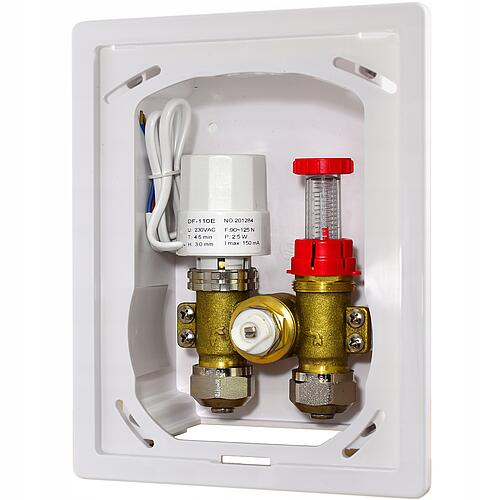 Kasetowy zestaw do regulowania temperatury ogrzewania podłogowego. Zestaw składa się z elektrycznego siłownika DF-110E, odpowietrznika i rotametru do wyregulowania przepływu czynnika grzewczego. Montaż wykonywany jest na powrocie pętli ogrzewania podłogowego.