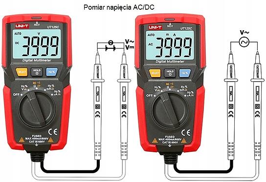 - Pomiar napięcia AC/DC do 600V,