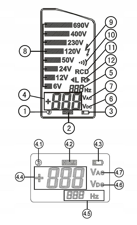 - wykrywanie napięcia AC~ lub DC+/- (sygnalizacja akustyczna buzzerem)