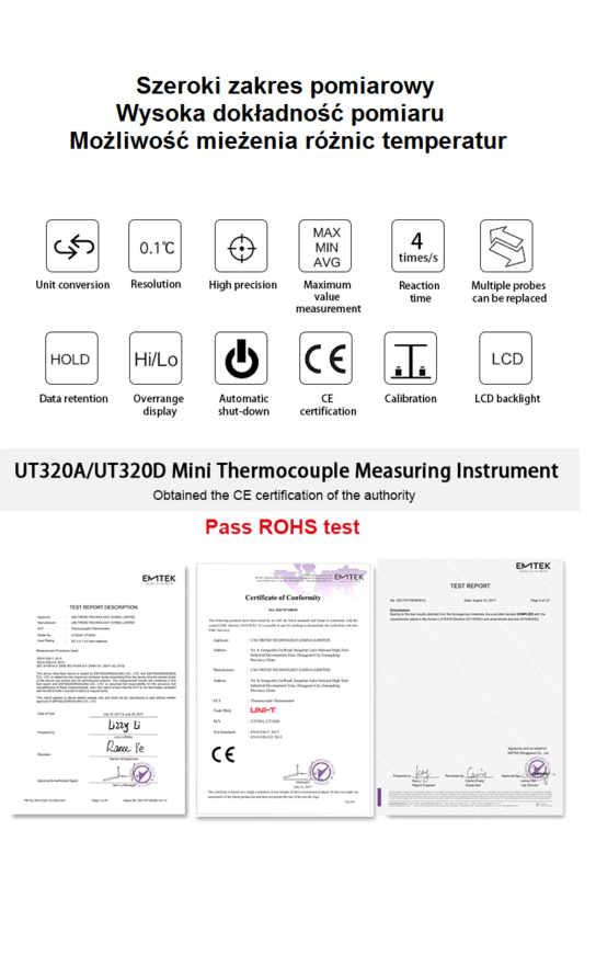 Funkcje | - pomiar z dwóch sond - odczyt temperatury z termopar typ K oraz J - zatrzymanie pomiaru na wyświetlaczu - OFFSET - płynna kalibracja czujników - pamięć wartości maksymalnej - wskaźnik wyczerpania baterii - pomiar różnicy (T1-T2) - MAX/ MIN / AVG |