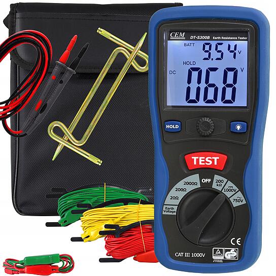 Miernik rezystancji uziemienia CEM DT-5300B to profesjonalny przyrząd do pomiaru rezystancji uziemienia w instalacjach elektrycznych i odgromowych. Umożliwia dokładny pomiar 3-przewodowy oraz prosty pomiar 2-przewodowy.