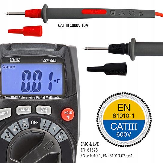Certyfikat CE, EN61010-1 CAT III - 600V.