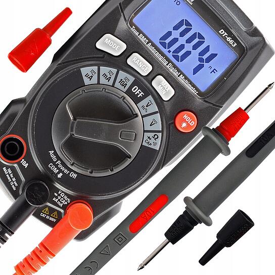 Multimetr DT-663 to wielofunkcyjny przyrząd pomiarowy, który oferuje funkcje takie jak amperomierz i woltomierz. Jest to urządzenie zaprojektowane dla profesjonalistów jak i majsterkowiczów, zapewnia precyzyjne pomiary w różnych zastosowaniach. Multimetr ten wyróżnia się automatycznym doborem zakresu pomiarowego, co ułatwia użytkowanie i zwiększa efektywność pracy. Ponadto, jego kompaktowa konstrukcja i podświetlany wyświetlacz sprawiają, że jest to narzędzie praktyczne i wygodne w codziennym użyciu.