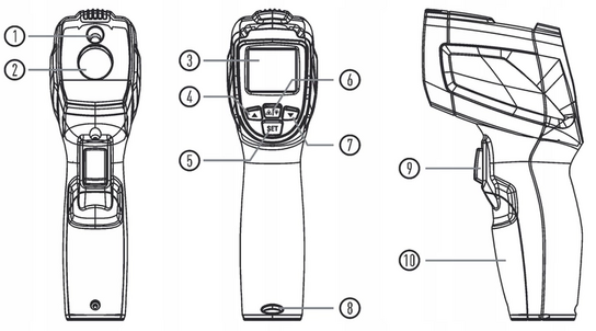 Miernik do dlanego pomiaru temperatury (pirometr) i wilgotności powietrza z regulowanym współczynnikiem emisyjności w zakresie od 0,1 do 1,0.