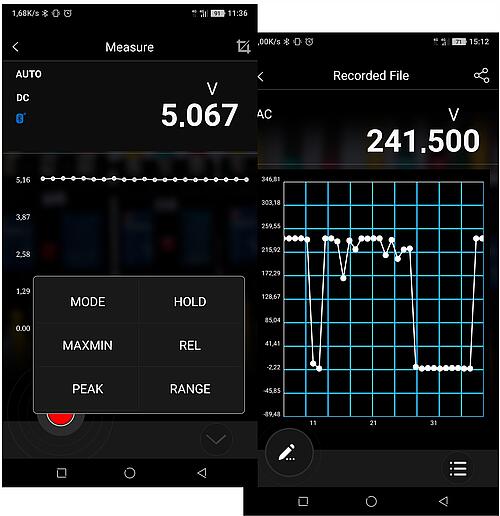 Aplikacja pozwala na przełączanie dostępnych funkcji takich jak: MODE, HOLD, MAX MIN, REL, PEAK, RANGE z poziomu smartfonu.