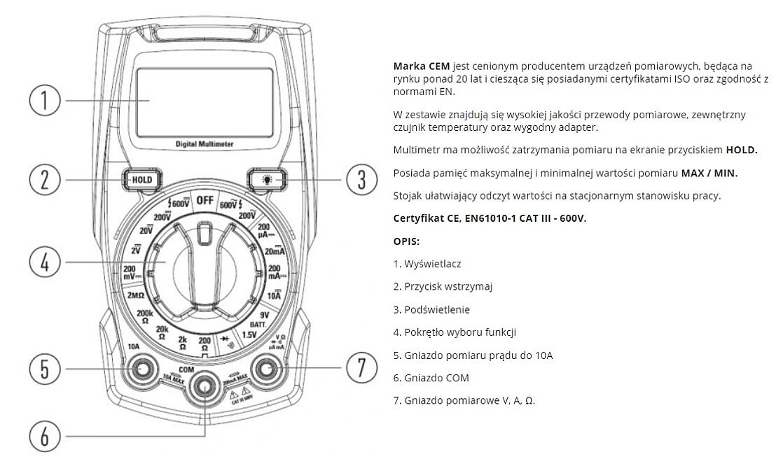 - Zestaw zawiera: komplet przewodów pomiarowych, baterie 2x1,5V, instrukcje w j. polskim