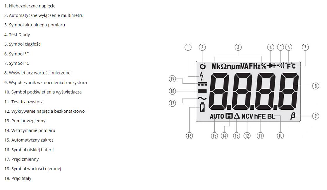 Multimetr umożliwia pomiar napięcia, prądu, rezystancji, pojemności, częstotliwości, temperatury oraz diod. Wyposażony jest w funkcję automatycznego wyłączenia, która oszczędza baterię. Kapturki na końcówki pomiarowe zwiększają bezpieczeństwo podczas pracy.
