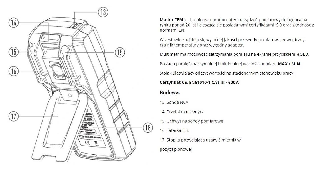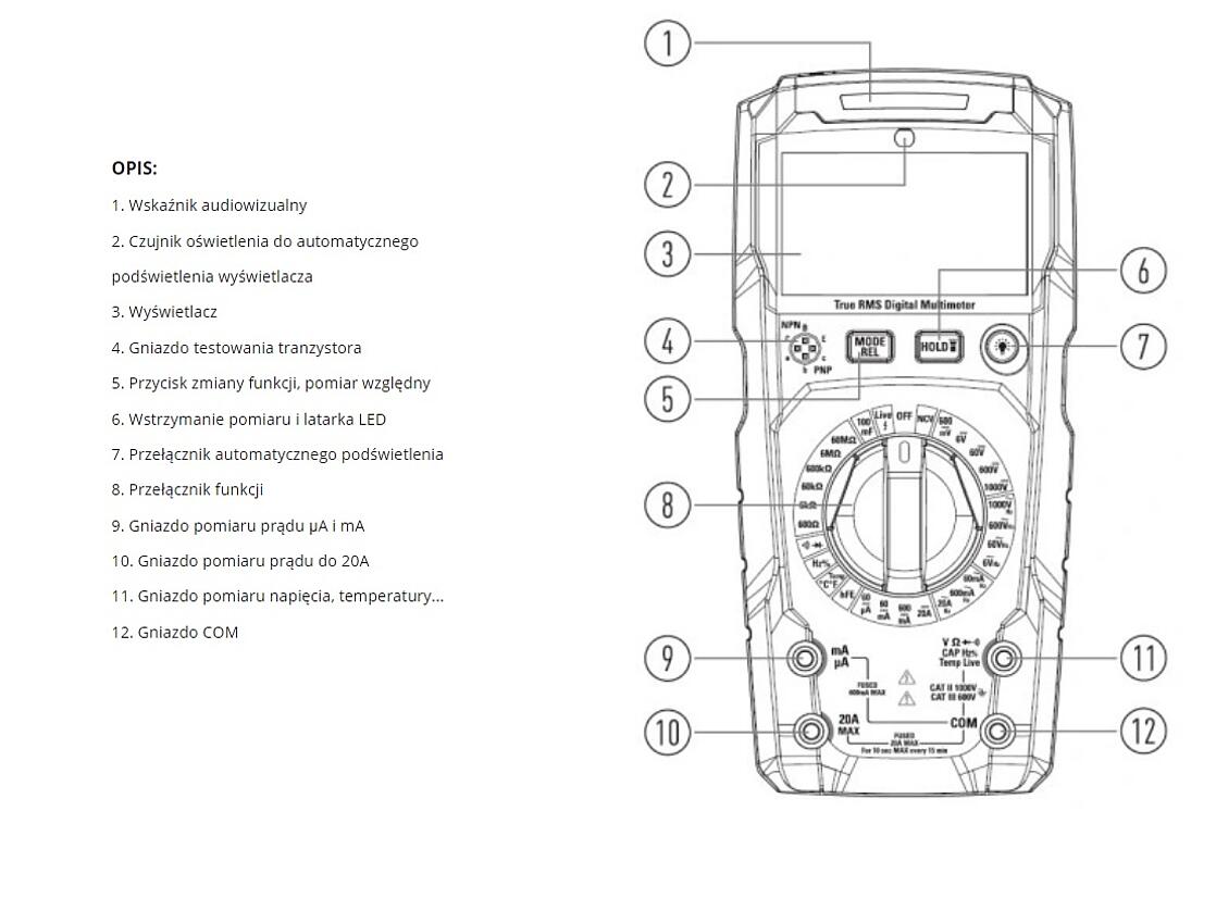 - Zestaw zawiera: komplet przewodów pomiarowych, pokrowiec, czujnik temperatury baterie 4x1,5V, instrukcje w j. polskim