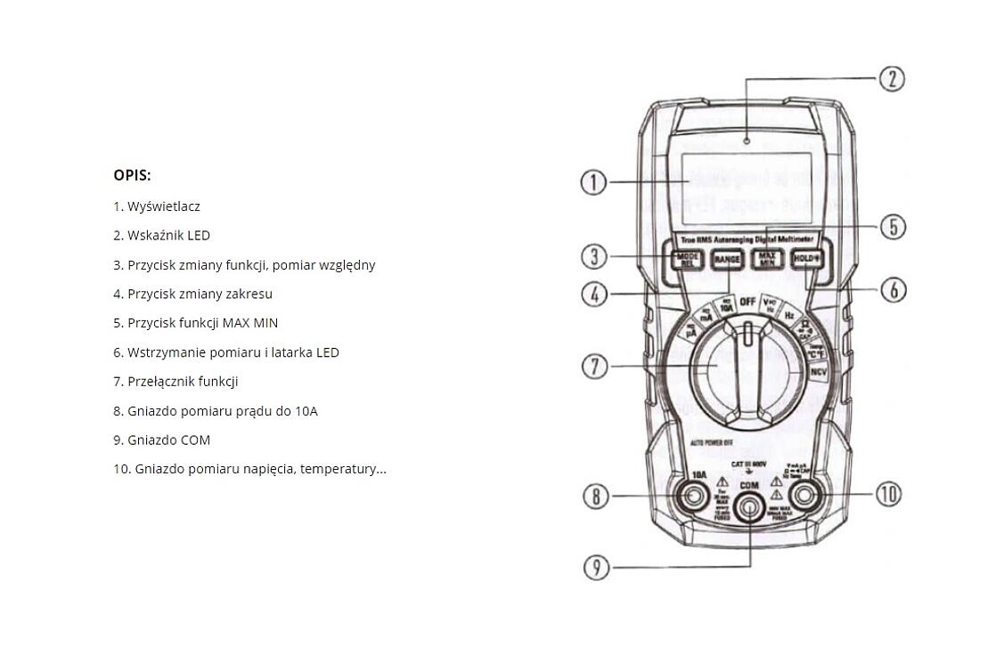 - Zestaw zawiera: komplet przewodów pomiarowych, baterie 2x1,5V, instrukcje w j. polskim