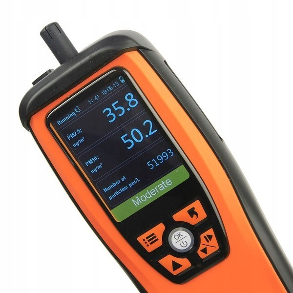 Laserowy detektor cząstek pyłu zawieszonego w powietrzu przeznaczony do pomiaru stężenia cząstek o średnicach PM2,5 PM10 dwutlenku węgla CO2, HCHO oraz temperatury i wilgotności powietrza.