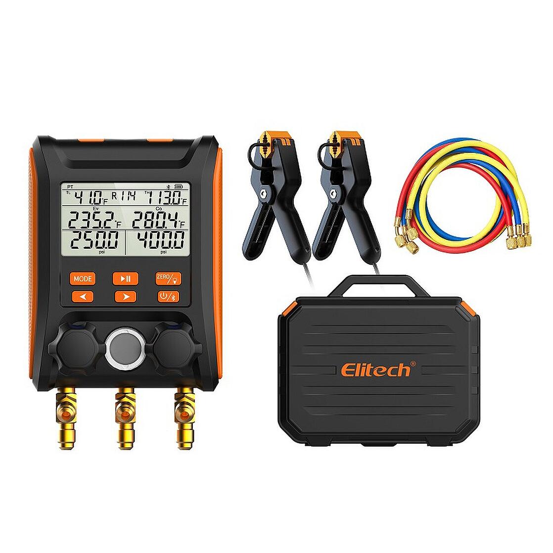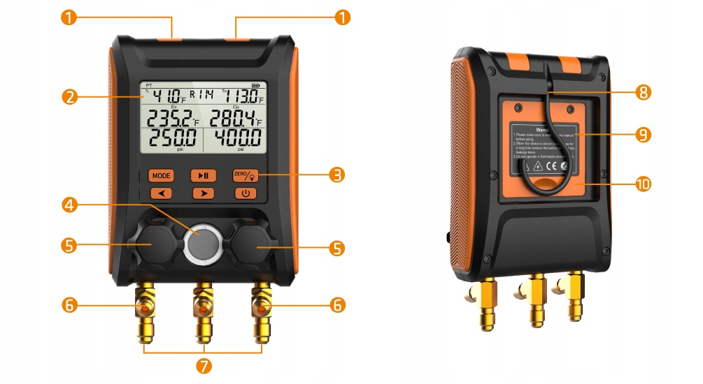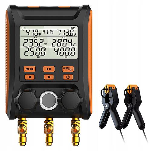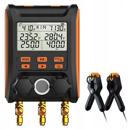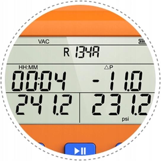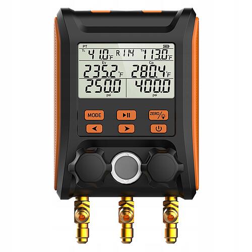 Elektroniczne manometry poprawiają komfort i precyzję aplikacji czynnika do układu. Obsługuje 88 różnych czynników chłodniczych min: R134A, r1234yf, R600, R600A, R601, R601A.