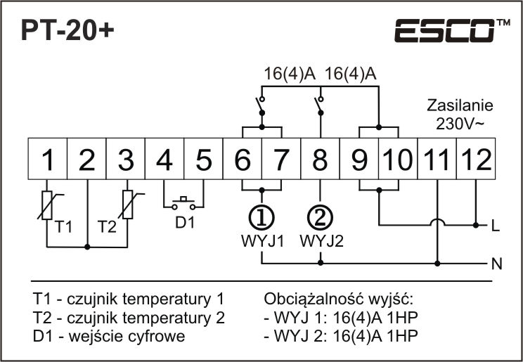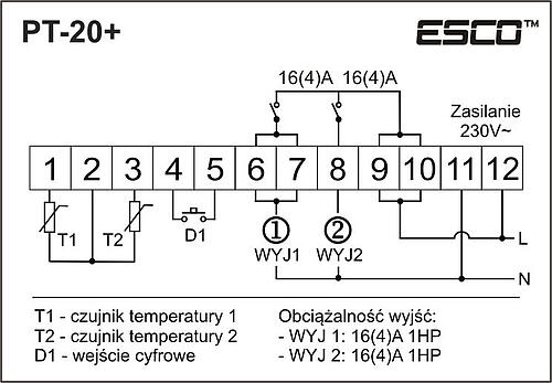 Model PT20+ został wyposażony w dwa wejścia na czujniki temperatury, dwa wyjścia przekaźnikowe oraz wejście cyfrowe. Regulatory są zdolne do powiązania wyjść przekaźnikowych oraz pomiaru uśrednionej wartości temperatury z dwóch czujników, jak też pomiaru różnicowego. Producent zadbał o zapewnienie użytkownikowi możliwości ustalenia wartości nastawy, co pozwala na sterowanie strefą martwą.