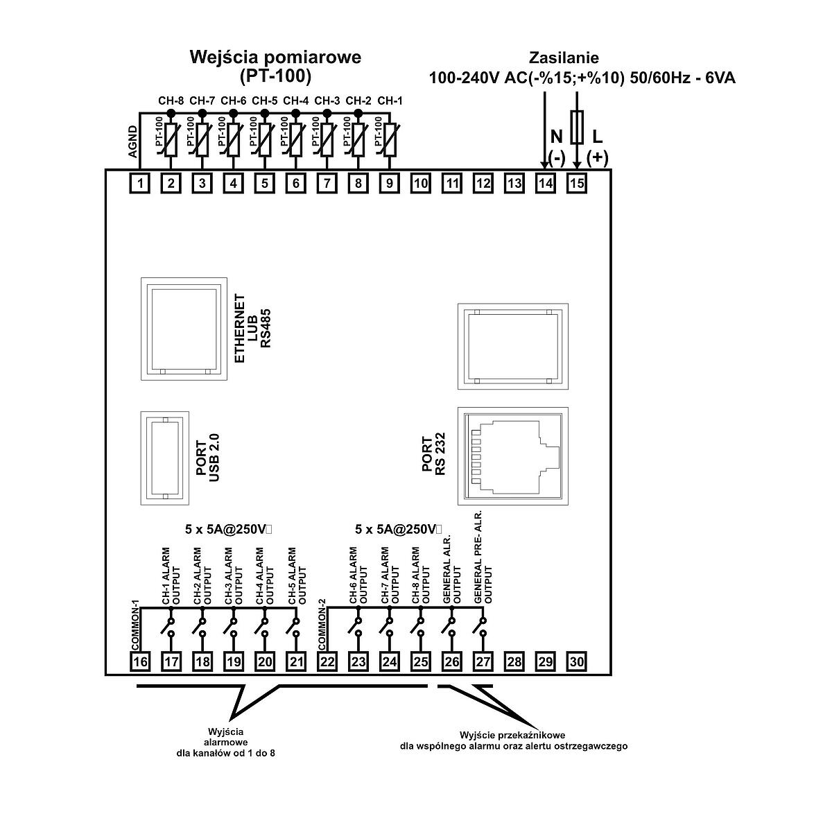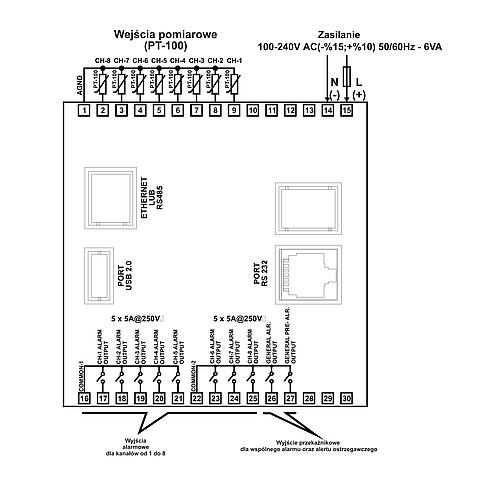 Urządzenie umożliwia podłączenie 8 czujników Pt100 i jednoczesną rejestrację wyników pomiarów każdego z nich. Dla każdego kanału z osobna można ustawić alarm: MIN, MAX lub pasmowy oraz alert ostrzegawczy. Wszystkie wartości razem z histerezą alarmów i pasmem strefy martwej programuje się