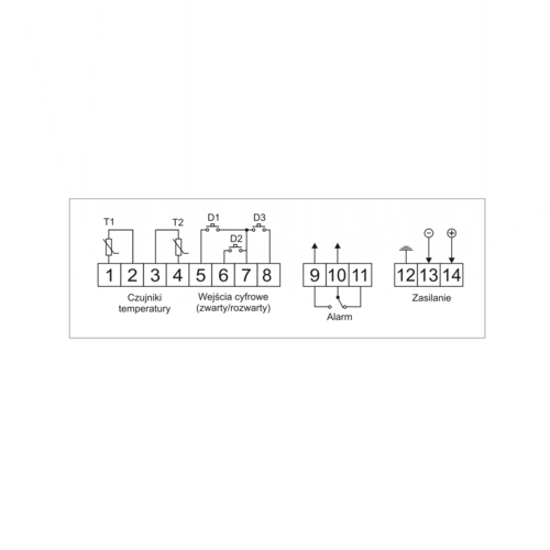 Wejścia: | 3 czujniki temperatury: NTC 5kΩ przy 25°C lub Pt100 3 wejścia cyfrowe (normalnie zwarte lub rozwarte) |
