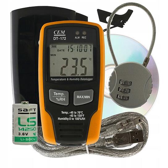 Przenośny rejestrator temperatury i wilgotności z wyświetlaniem bieżących wartości na wyświetlaczu LCD. Posiada wbudowany czujnik temperatury i wilgotności. Znajduje szerokie zastosowanie wszędzie tam gdzie niezbędna jest archiwizacja temperatury. Szczególnie w przemyśle spożywczym, rolniczym, chłodniczym, farmaceutycznym i laboratoryjnym. Stosowany również w transporcie chłodniczym. Podgląd max i minimalnej temperatury i wilgotności zmierzonej, sygnalizacja optyczna przekroczonych progów alarmowych. Możliwość montażu w uchwycie zabezpieczającym przed kradzieżą.