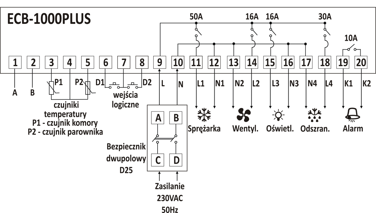 - sterownik ECB-1000Plus WiFi jest przeznaczony do obsługi komory chłodniczej ze sprężarką jednofazową o mocy do 3HP (2200W).