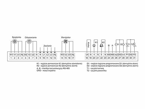 Wyjścia: | - spreżarka: 10HP (10KM) 3-fazy - odszranianie: 11000W 3-fazy - wentylator: 4000W 3-fazy - karter: 1100W 1-faza - alarm: 1100W 1-faza - oświetlenie: 1100W 1-faza |