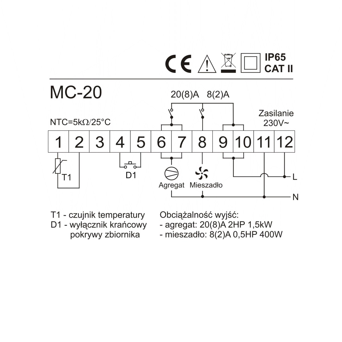 W przypadku naruszenia czujnika temperatury, sterownik przechodzi w tryb awaryjny. Dodatkowo, model MC-20 został wzbogacony o funkcję ochrony agregatu oraz powiadomieniach o nagłym wzroście / spadku temperatury (sygnał dźwiękowy). Zastosowanie przekaźnika o dużej obciążalności umożliwiło zarządzanie jednofazowym agregatem chłodniczym bezpośrednio przez układ.