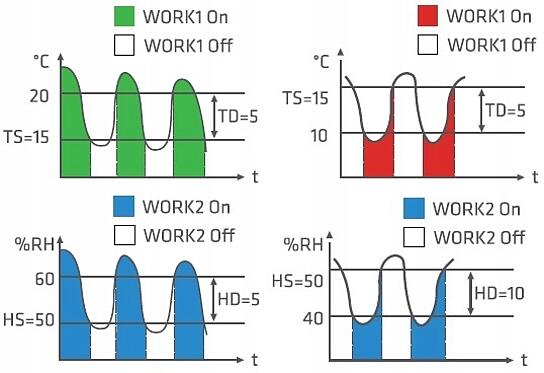 Regulator work1 służy do utrzymywania temperatury TS z zadaną histerezą TD - dla chłodzenia w urządzeniach chłodniczych i dla grzania w urządzeniach grzewczych. Sterowanie elementem wykonawczym odbywa się przez wyjście przekaźnikowe, zaś pomiar temperatury dokonywany jest przy pomocy czujnika temperatury i wilgotności. Zasada działania regulacji temperatury przy grzaniu i chłodzeniu na rysunku obok - (WORK1).